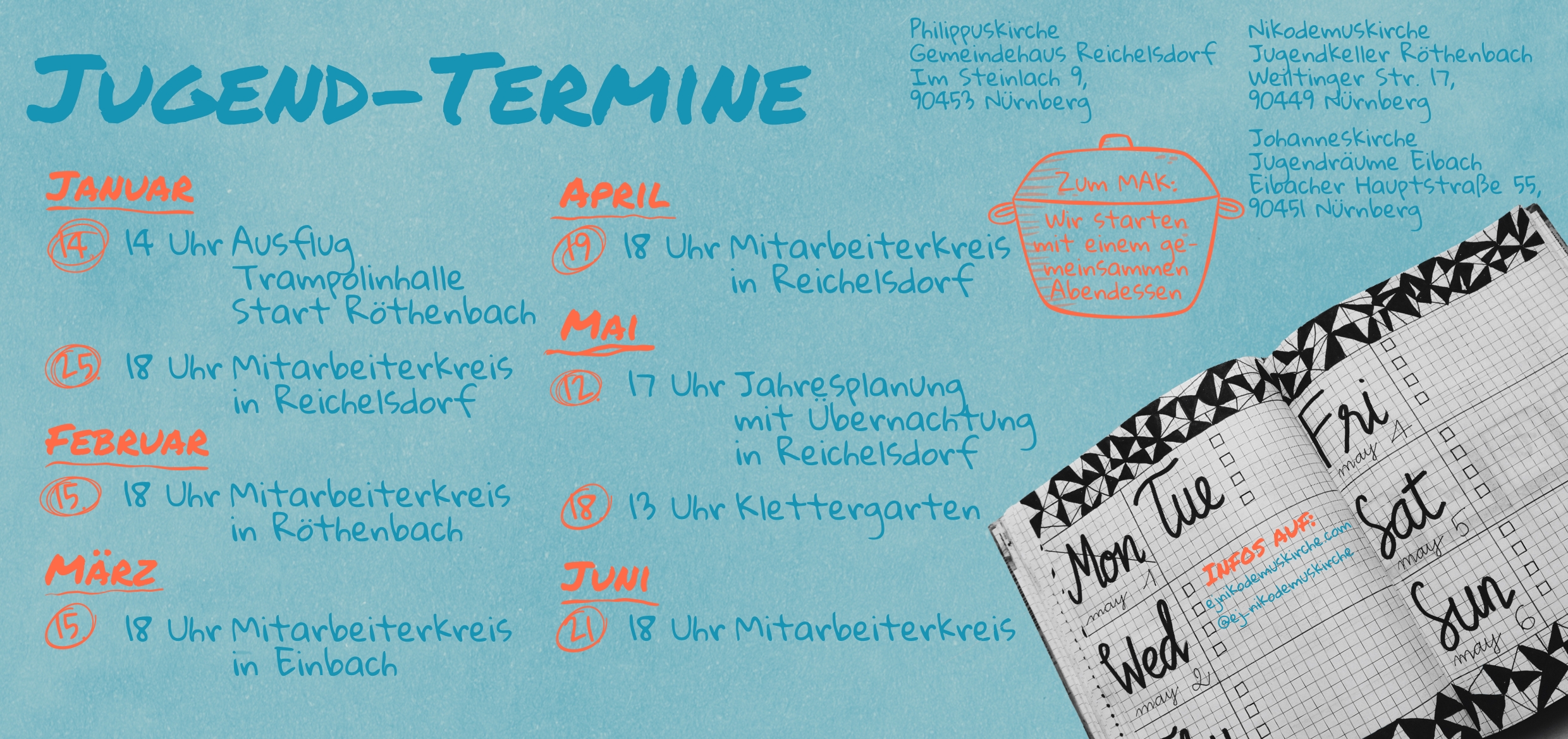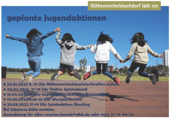 | 25. Januar | 18 Uhr | Mitarbeiterkreis (MAK) | Reichelsdorf Beim Wahlbaum 20 |